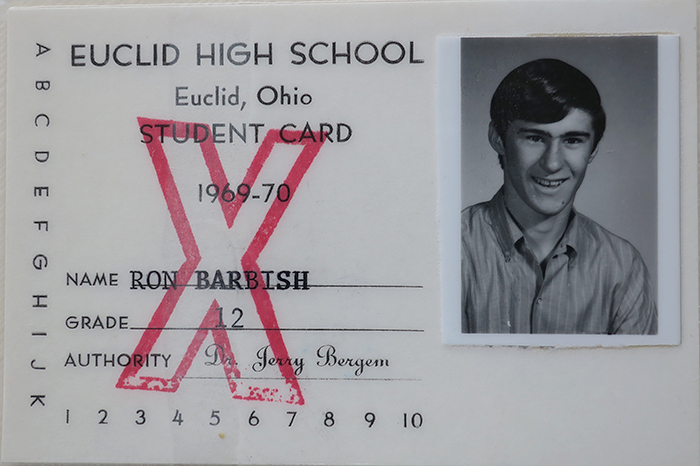 My student ID from my senior year at Euclid High School. The "X" on the ID means I was banned from everything. Hard to believe this was considered long hair.