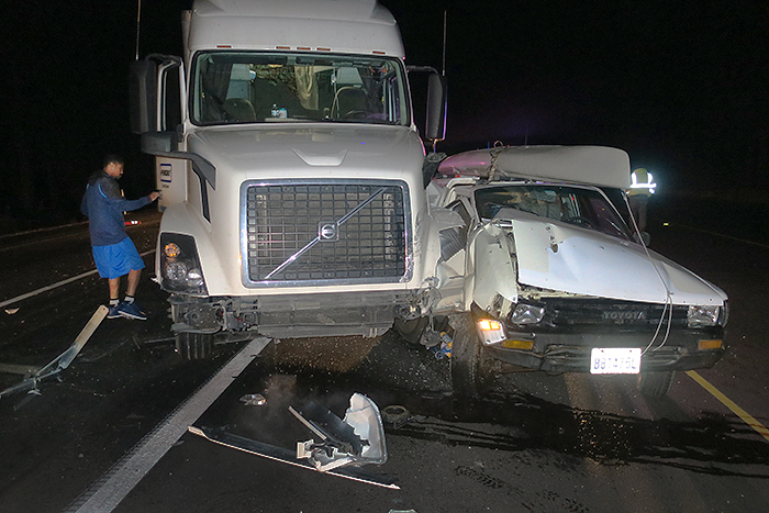 I was unconscious for a minute or two after impact until the voices of the construction workers trying to pull me through the drivers side window of the crushed truck woke me up. A quick look around told me I was in big trouble. Everything in the cab of my truck was crushed or on the highway and the front wheel of the semi truck was in the passenger seat.